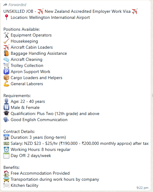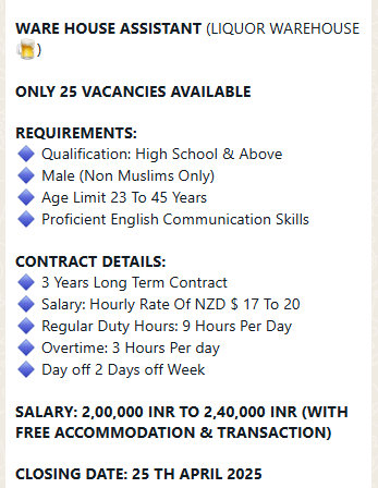 ഇത്തരം അൺസ്കിൽഡ് ജോലികൾക്കായി ഏത് ഏജൻസി NZ ലേക്ക് വേക്കൻസി ഉണ്ട് എന്ന് പറഞ്ഞു പരസ്യം ചെയ്താലും അതൊരു വിസ തട്ടിപ്പ് ആണെന്ന് മനസിലാക്കുക.